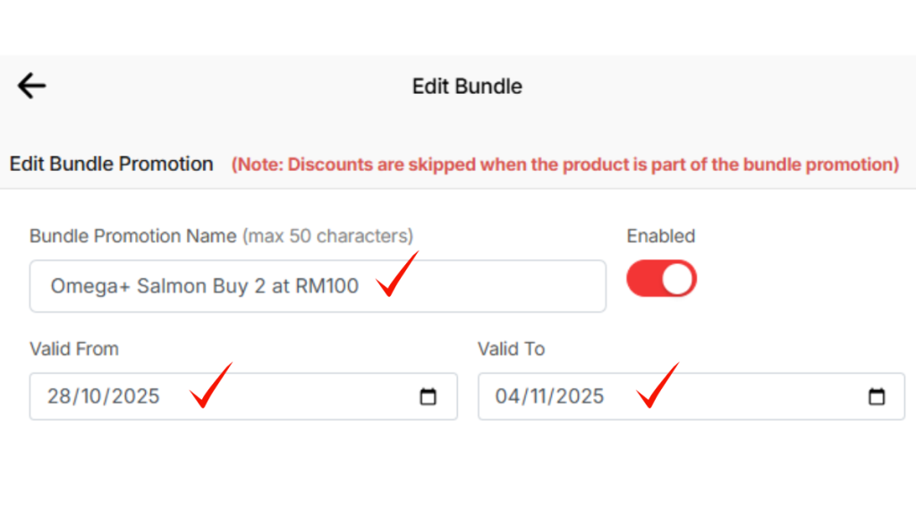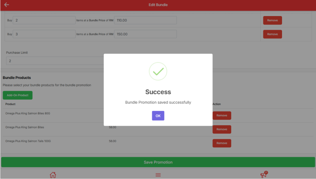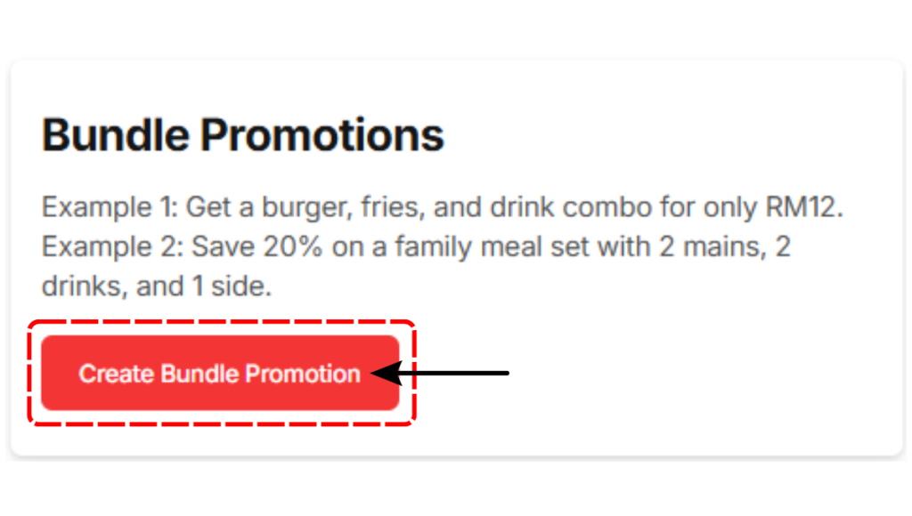 The Bundle Promotion feature lets you combine multiple products into one deals – perfect for meal sets, gift boxes, or seasonal offers.