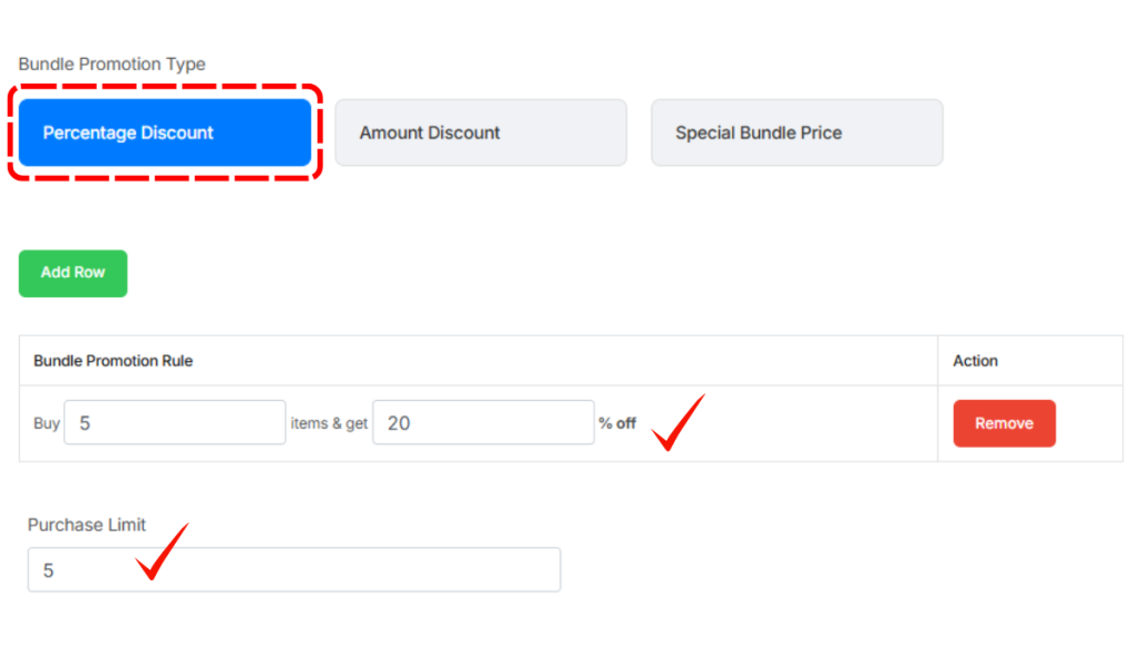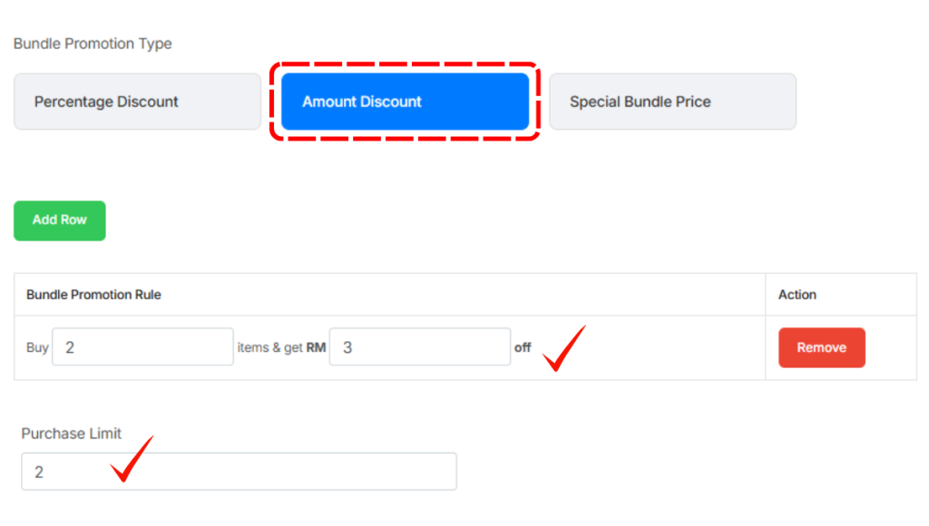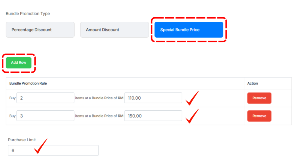 Choose the Bundle Promotion Type and key in the Bundle Promotion Rule and Purchase Limit.