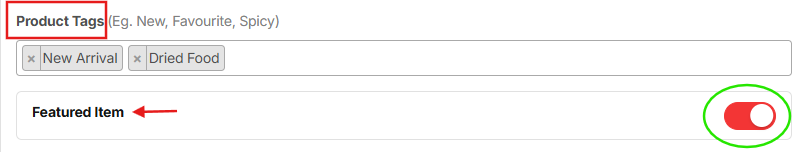 While still in the product edit screen, find the Product tag field (just above the Featured) and add tags (examples: New, Favourite, Spicy, On Sale, Homemade).