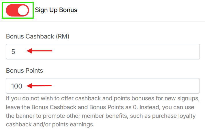 If you do not wish to offer cashback or points bonuses for new signups, simply leave Bonus Cashback and Bonus Points as 0.
