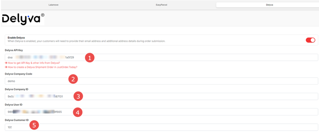 D. Fill the 5 fields to JustOrder.Today’s Delyva Setup Page.