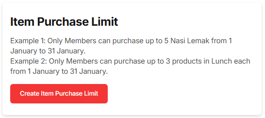Select “Create Item Purchase Limit”. Each promotion type comes with a sample use case. This helps you choose the correct discount method based on your campaign objective—for example, this promotion type is designed specifically to control product purchase limits for members.