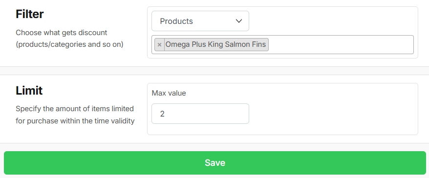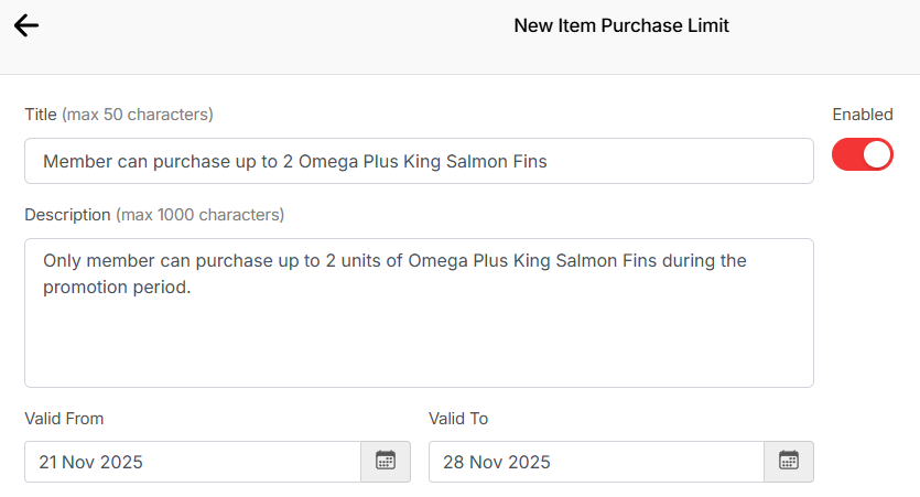 Save the promotion. Once saved, the purchase limit will be applied automatically for all members during checkout.