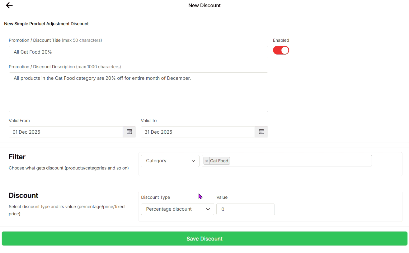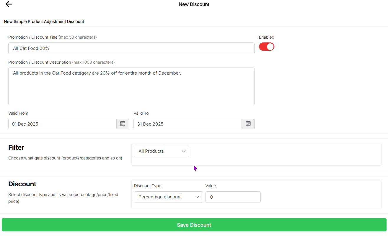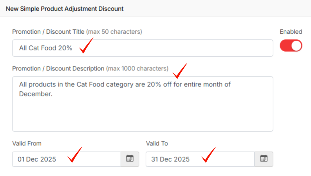 Then write a short and clear description of your promotion. Mention what the offer is, the discount amount, and any specific conditions (e.g. “All products in the Cat Food category are 20% off”). This helps customers quickly understand your deal.