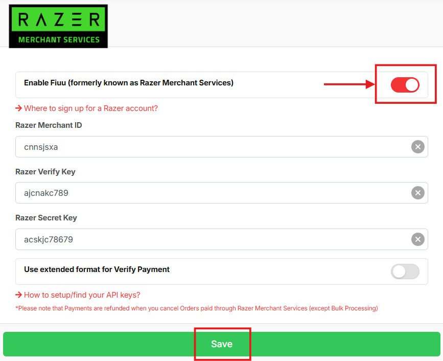 打开“启用 Fiuu”开关并点击 节省 完成集成。.