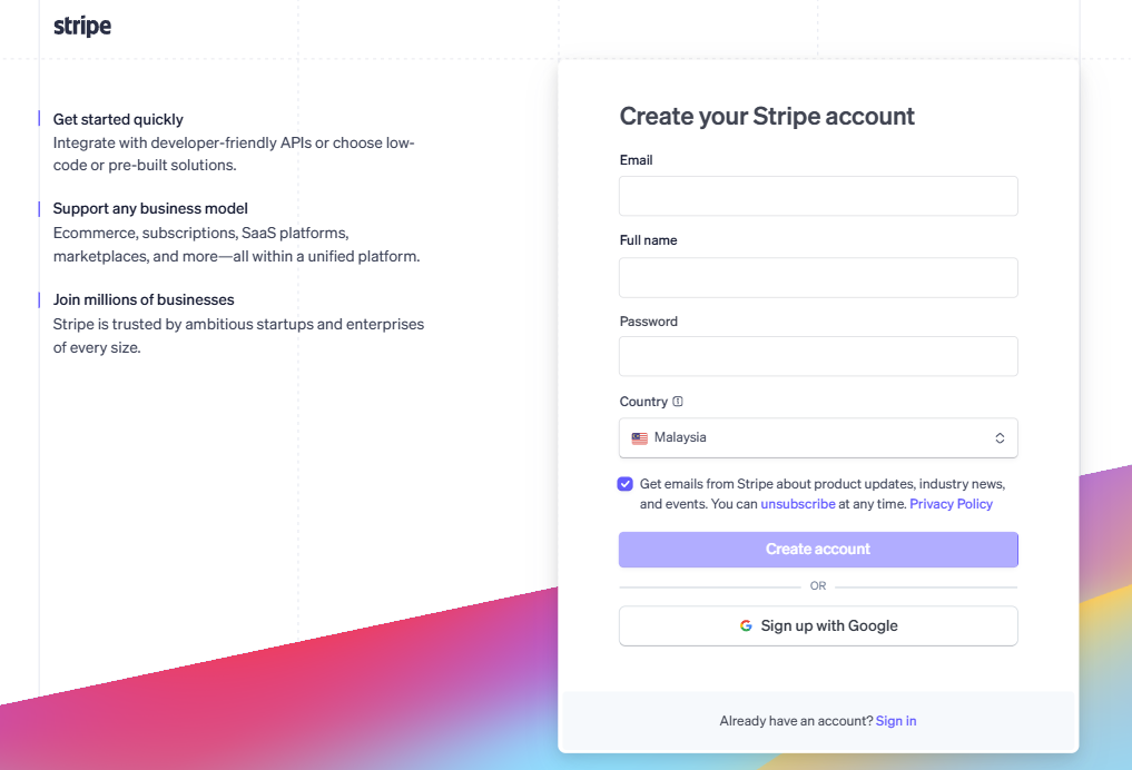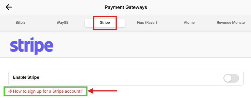 点击 条纹 在顶部。然后点击超链接 注册您的 Stripe 账户 完成申请流程。等待您的 Stripe 账户获得批准。.