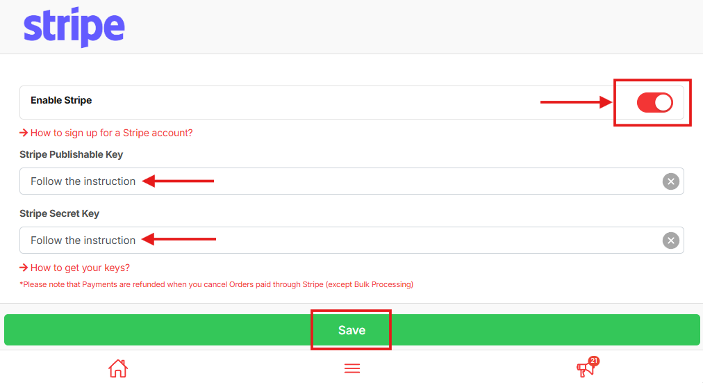 打开 启用 Stripe 切换并点击 节省 为您的店铺启用 Stripe。.